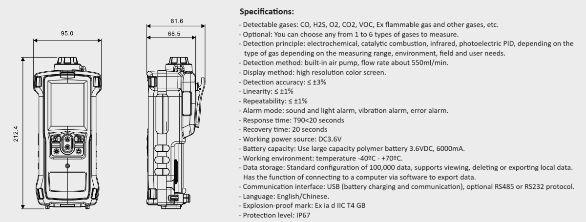 - Chuyển đổi đơn vị đo là tùy chọn: PPM, mg/m3, %Vol, %LEL, PPHM, ppb, mg/L; Các loại khí đặc biệt cần nhập trọng lượng phân tử để tự động chuyển đổi.
