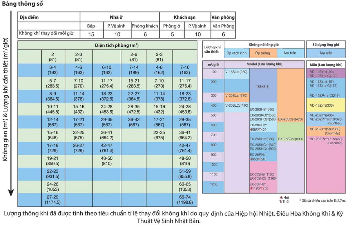 1. Bảng hướng dẫn cách chọn quạt thông gió phù hợp với từng loại phòng