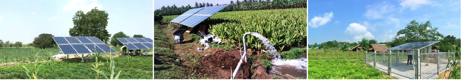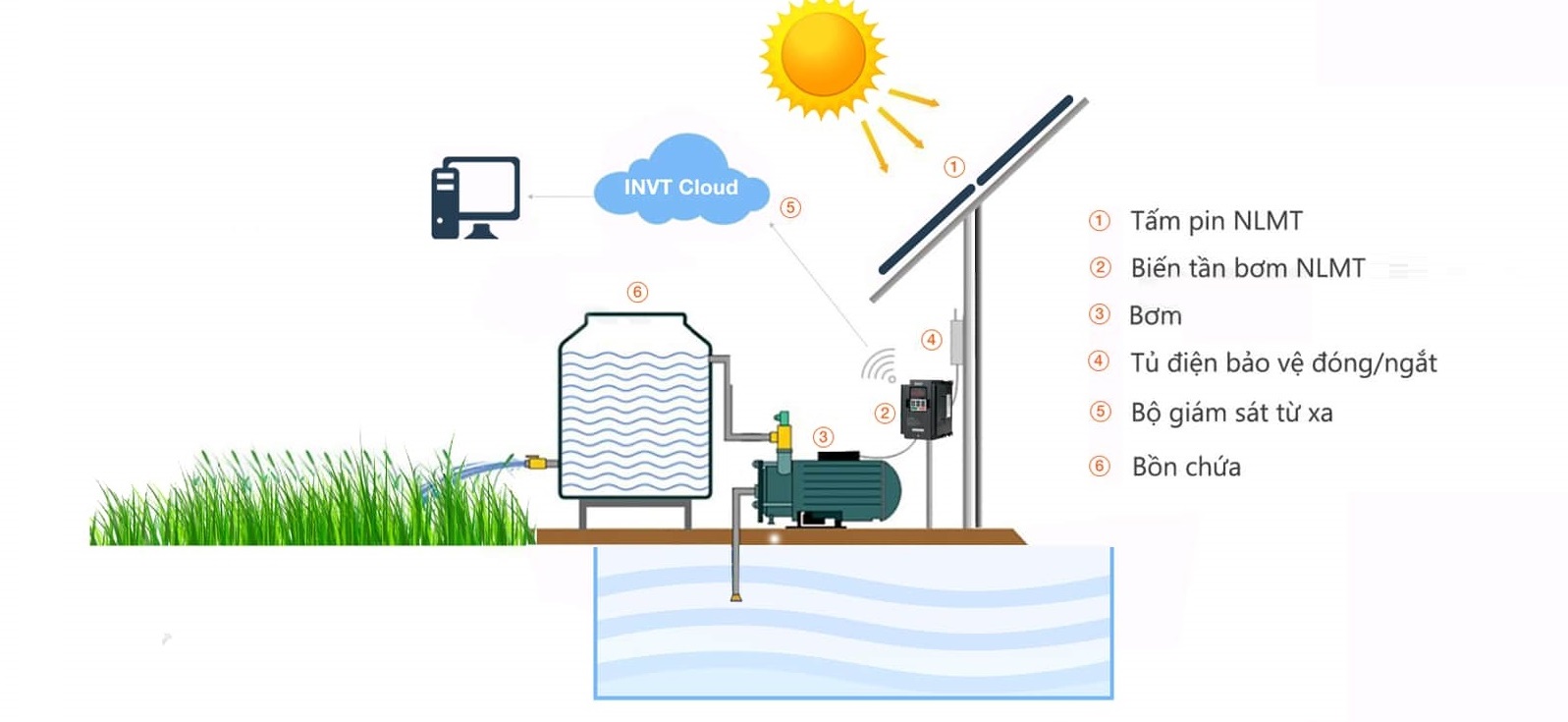 - Giải pháp bơm nước năng lượng mặt trời độc lập xóa nỗi lo thiếu điện tưới tiêu cho nông dân tại các trang trại vùng sâu, vùng xa,.. chưa có điện lưới quốc gia kéo đến. Hệ thống tận dụng nguồn điện từ hệ thống điện năng lượng mặt trời để điều khiển trực tiếp máy bơm nước. Nguồn nước được bơm lên và dự trữ vào các hồ chứa để tưới tiêu trong ngày hoặc bơm tưới tiêu trực tiếp trong ngày.
